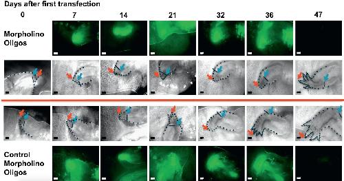 Fig. 3. Comparison of the regeneration progress in the right and left regenerating forelimbs from the same animal, with one transfected with mixed PL1 and PL2 MOs on day 5 pa and the other transfected with the mixed control MOs. Green fluorescence images demonstrate transfection efficiency in the limb regenerates. The blue arrows indicate the amputation planes and the red arrows indicate the tip of the limb regenerates. A microcaliper was used to measure the length of the blastema (from the amputation plane to the tip of the blastema) with the 0 mm line precisely marking the amputation plane. The 0 mm lines in the images were further strengthened in deep blue color. The microcaliper was placed perpendicularly to the blastemal AP axis. Deep blue dots were added along the outlines of regenerating limbs to make the regenerating limbs more visible. Scale bars=1 mm.