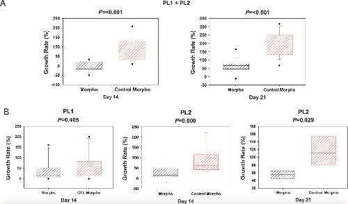 Fig. 4. Effect of PL1 and PL2 knockdown mediated by morpholino oligos (MO) on axolotl limb regeneration: (A) Evaluation of limbblastema growth rate by PL1 and PL2 MO transfection in limb regenerates. Length of limb blastemas was measured at days 14 and 21 after the first transfection to determine whether there was a differential pace of limb regeneration in the presence of PL1 and PL2 MOs. Results are compiled from four different experiments. 17 animals were used. P values are presented in the graph (PL1 and PL2 MOs, n=17; control MOs, n=17). (B) Effect of PL1 or PL2 individual knockdown in the growth rate of limb blastemas. The result for day 14 was obtained from two different experiments. In total 10 (for PL1) or 9 (for PL2) animals were used. The result for PL2 on day 21 was obtained from one experiment in which two animals were used. P values are presented in the graphs (PL1 and PL2 MO and control MO, n=10; PL2 day 14, MO and control MO, n=9; PL2 day 21, MO and control MO, n=4).