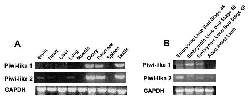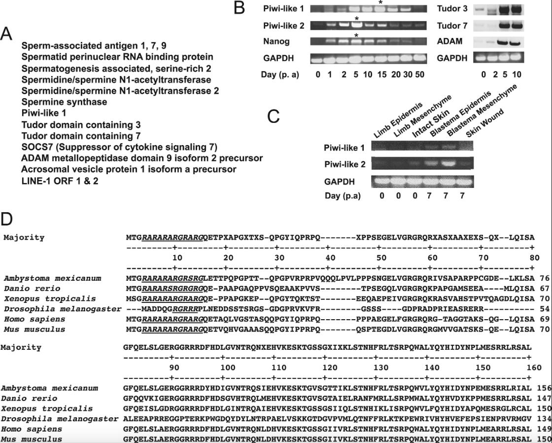 Fig. 1. Piwi-like 1 and 2 are specifically upregulated upon axolotl limb regeneration: (A) Listed here are the germline-specific genes found to be expressed in regenerating axolotl limbs upon limb amputation using Roche 454 cDNA sequencing. (B) RTâPCR time-course. Examination of the transcriptional activities of some of the indicated germline-specific genes during the process of axolotl limb regeneration. GAPDH was used as a control. The transcriptional activity peaks of PL1, PL2 and Nanog were labeled with asterisks. (C) RTâPCR analysis of PL1 and PL2 transcriptional activity in the intact limbepidermis or mesenchyme, and in a healing superficiallimbskin wound and regenerating limb blastemal epidermis and mesenchyme. (D) Alignment of the N-terminal sequence of PL1 protein from several organisms, demonstrating that the arginine/alanine-rich motif (italic and underlined), a potential target for regulatory methylation, is evolutionarily conserved.