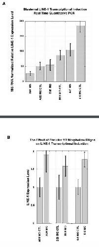 Supplementary Fig. S3 LINE-1 cDNA Real Time qPCR examination of the effect of PL1/2 MOs on LINE-1 transcriptional upregulation during axolotl limb regeneration. PL1/2 MOs or control MOs were injected into the two forelimbs, respectively in the same animal 7 days pa. Electroporation was performed afterwards immediately to facilitate tissue transfection of the oligos. 7 days after MO injection, limb blastemas were collected and total RNA was extracted for RT qPCR. Limb tissues harvested on day 0 during limb amputation were also subjected for total RNA extraction and RT qPCR. Quantitative PCR was performed using Applied Biosystemsâ Power SYBR Green system. A09 and D08 are the two sets of qPCR primers for LINE-1 ORF1, while 6-5 is for LINE-1 ORF2. t: days after limb amputation. The housekeeping gene, 18S RNA was used for