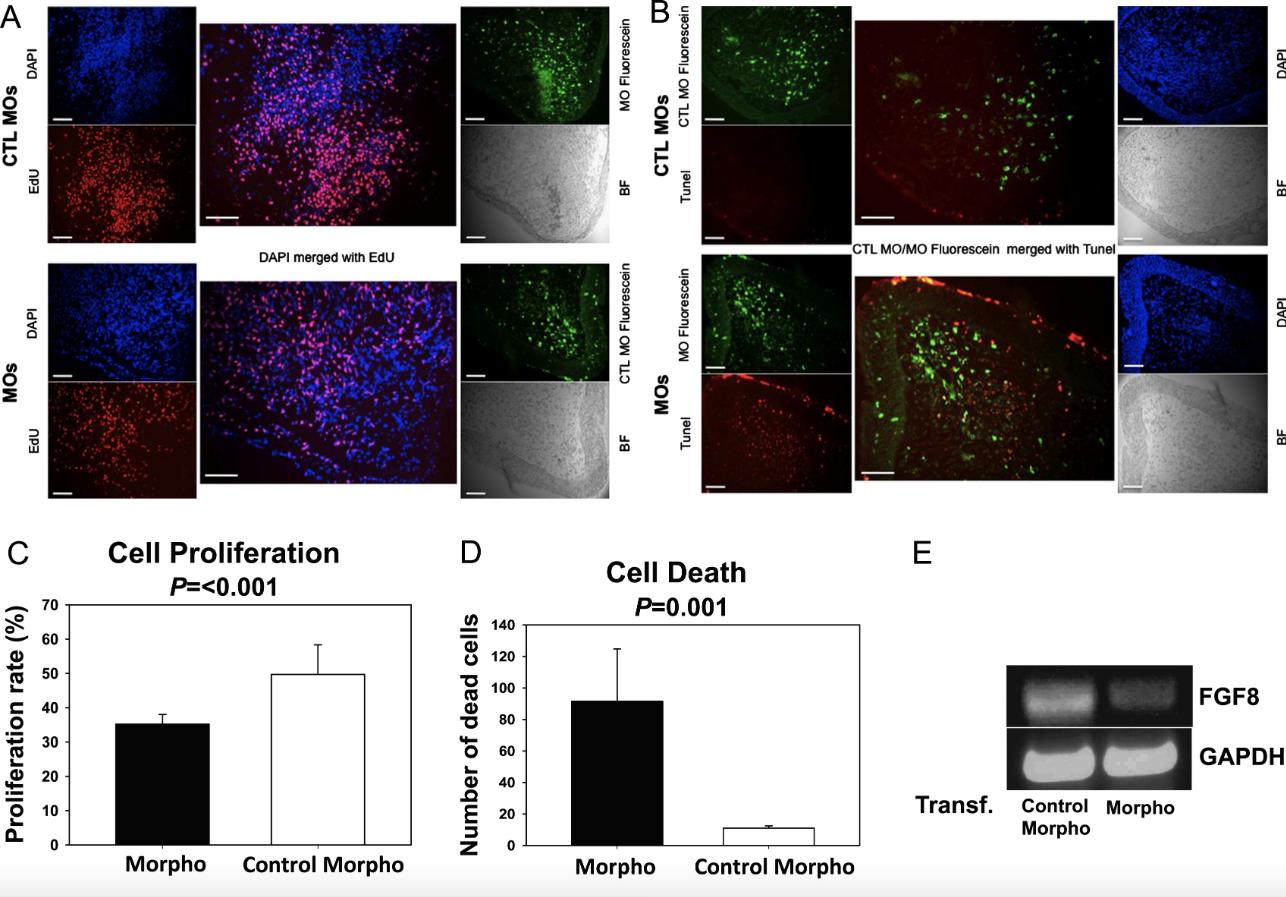 Fig. 5. Transfection of PL1 and PL2 MOs in the regenerating forelimb blastemas affects cell proliferation and cell death. MO transfection was performed at 7 day pa with PL1/2 MOs injected in one forelimb of an animal and the control MOs in the other forelimb of the same animal, respectively. Limb regenerate tissues were collected another 7 days after MO transfection. To provide a baseline control, the total RNA extracted from limb tissues harvested on day 0 during limb amputation was also subjected to RT qPCR: (A) Examination of proliferation by detection of EdU incorporated into genomic DNA. (B) TUNEL staining of limb blastemas. Scale bars=200 μm. (C, D) Statistical analysis of the effect of PL1 and PL2 knockdown on cell proliferation and cell death during limb regeneration. The percentage of proliferating cells was determined by the ratio of EdU-labeled cells in the population of DAPI-stained cells. We counted the absolute numbers of dead cells stained in red in the TUNEL assay to assess cell death rate. Error bars indicate the mean ±SD, n=7â8 per group (n=7â8 refers to tissue section slides, and the tissue sections were derived from three animals). (E) Axolotl PL1 and PL2 MO transfection led to decreased expression of FGF8 in the regenerating axolotl limbblastema. MOs were injected into one of the regenerating forelimb blastemas (5 dpa) while the control MOs were injected into the other forelimbblastema of the same animal. Seven days after transfection, limb blastemas were collected and total RNA was extracted for RT-PCR analysis. The tissue sections used for the quantitation analysis shown in panels C and D, and for the images shown in panels A and B were obtained from two separate experiments.