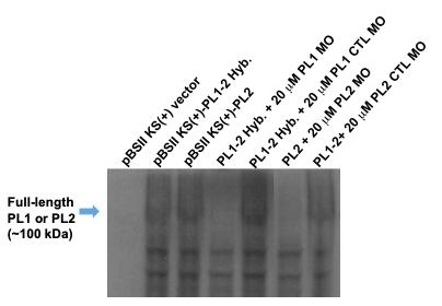 Supplementary Fig. S2 In vitro transcription and translation assay to verify that the axolotl PL1 and PL2 MOs specifically inhibit PL1 and PL2 protein translation,