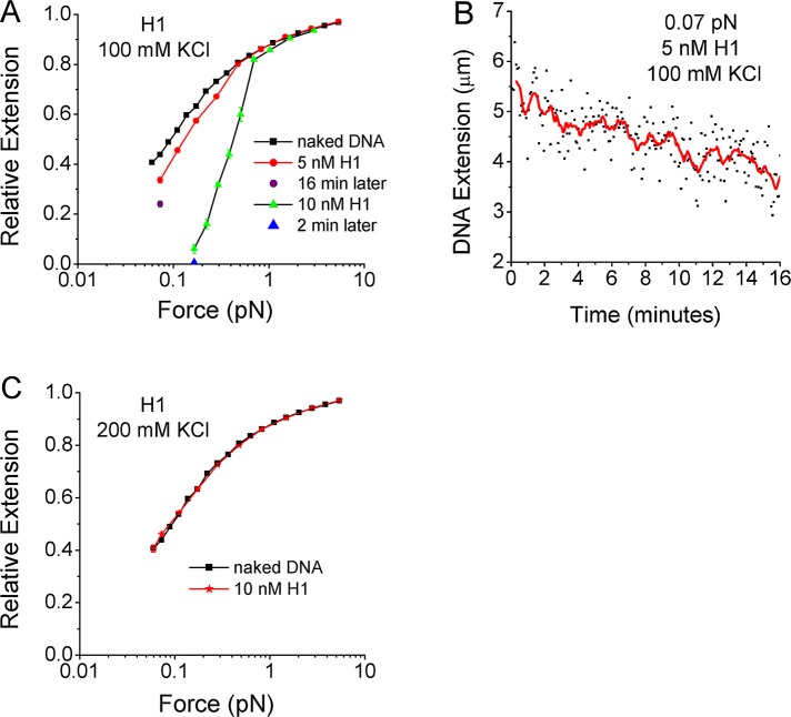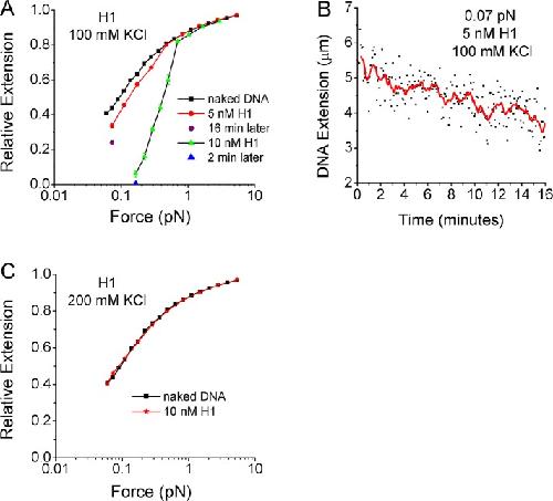 FIGURE 1:. Dependence of DNA condensation on force, H1, and salt conditions. (A) DNA extension measured as the force decreased in 100 mM KCl (XB buffer). In 5 nM H1 solution, the DNA extensions for forces of >0.6 pN were the same as in the buffer (naked DNA). The extension decreased as the holding force was reduced step by step from 0.6 to 0.07 pN. Each step lasted about 2 min, during which the extensions were measured. In separate samples, 10 nM H1 was added, and the DNA extension was measured as the force decreased from 5 to 0.2 pN. Between 0.2 and 1 pN, the DNA compaction ratios in 10 nM H1 were higher than in 5 nM H1. Each experimental data point, presented as the mean value, was obtained from 15 measurements. (B) DNA extension decreased with time in 5 nM H1 solution with a holding force of 0.07 pN. The extension decreased from 5.6 to 3.7 μm in 16 min (A, 16 min later) and to ∼0.1 μm in 1 h. (C) In contrast to A, no compaction was observed for 10 nM H1 in 200 mM KCl buffer (XB + KCl) with a holding force of >0.1 pN.