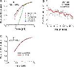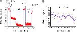 FIGURE 2:. DNA bending and looping by H1. (A) The extension remained stable with 12.5- and 2.1-pN holding forces in 10 nM H1. The thermal fluctuations are ∼150 nm around a fixed extension at 2.1 pN. After the force dropped to 1 pN, the extension decreased rapidly at the beginning and slowed down in ∼4 min. The force was further decreased to 0.5 pN. The extension decreased to 0 in ∼8 min. At 10 nM H1, a relatively low concentration, continuous nanometer-scale decreases are suggestive of compaction by bending. Larger, hundreds-of-nanometer drops strongly suggest loop formation. When force was subsequently increased to 12.5 pN the extension jumped to approximately the length of naked DNA. On switching from 12.5 to 0.5 pN, the extension dropped again. Finally, a force increase to 2.7 pN increased the DNA extension. (B) Expanded view of compaction at 1 pN described in A. The thermal fluctuations at 1 pN are ∼200 nm. The DNA was observed to undergo compaction by 20- to 100-nm decreases (smoothed data). Results similar to those shown in A and B were observed in five separate experiments.