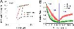 FIGURE 3:. DNA compaction in dH1, dMock, and dH1+H1. A. Averages of DNA extension decreased as the holding force was reduced progressively from 5 to ∼0.6 pN. The depleted extract (dH1, red square) and dH1 extract plus H1 (dH1+H1, black triangle) were both diluted 20 times (1:20). Each force step took 1 min. At each force, the compaction ratio for dH1 extract was smaller than for dH1+H1 extract. Each experimental data point, presented as the mean value, was obtained from ∼15 measurements. (B) Smoothed time series of DNA compaction in dH1, dMock, and dH1+H1 extracts diluted four times (1:4). The force was initially held at 5 pN for 5 min and then reduced to 2 pN to allow chromatin assembly. The dH1 had slower assembly rates and longer end length than the dMock and dH1+H1. After 10 min, the force was increased to 5 pN. The extension of dH1 increased faster than for dMock and dH1+H1. Each data point is presented as an average and standard error obtained from three or four separate experiments.