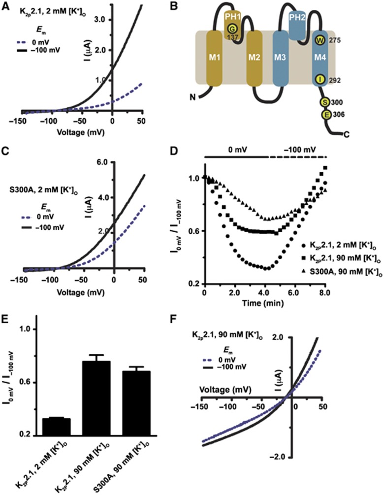 Figure 3. Mutations that stabilize the C-type gate antagonize regulation of K2P2.1 (TREK-1) by membrane potential. (A, B) Exemplar recordings from oocytes expressing the indicated K2P2.1 (TREK-1) mutants after prolonged incubation at, consecutively, â100 and 0 mV in 2 mM [K+]o pH 7.4. After current stabilization at â100 mV, the membrane potential was changed to 0 mV, and the current was recorded every 15 s using a voltage ramp from â150 to +50 mV. (C) Exemplar time resolution of channel activity from a representative cell in response to fluctuating EM in 2 mM [K+]o pH 7.4. Each point represents channel activity from the ramp curves at 0 mV. Data presented as fraction relative to activity after initial stabilization at â100 mV. (D) Quantification of maximal K2P2.1 (TREK-1) inhibition by prolonged incubation at 0 mV (mean±s.e., n⩾6, N⩾2). (E) Ribbon diagram showing the location of Trp275 and Gly137 of K2P2.1 (TREK-1) on the crystal structure of K2P4.1 (TRAAK) (Brohawn et al, 2012)(PDB ID 3UM7). M4, transmembrane helix 4. PH1, pore helix 1. Blue spheres depict potassium ions. |