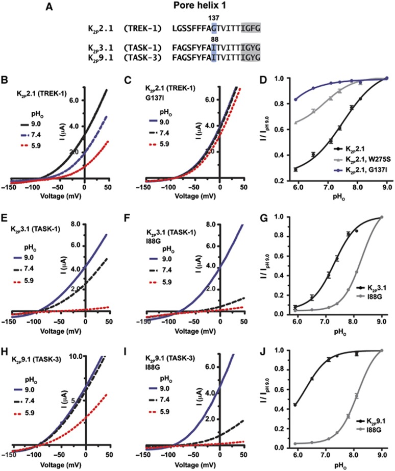 Figure 2. PH1 is critical for K2P channels C-type gating. (A) Amino-acid alignment of the PH1 region of the indicated K2P channels. The GXG selectivity filter sequence is highlighted in grey. (B, C, E, F, H, I) Exemplar recordings of the response of the indicated K2P channels to the external pH (pHo) changes in 2 mM [K+]o solution. Currents were elicited by a voltage ramp from −150 to +50 mV, from a holding potential of −80 mV. (D, G, J) Quantitation of the response of the K2P channels to changes in pHo. Data (mean±s.e., n⩾6, N⩾2) was taken at 0 mV, normalized to activity at pH 9.0, and fitted to the Hill equation. |