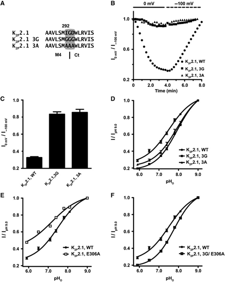 Figure 4. M4–Ct junction is critical for cross-talk between Ct and the C-type gate. (A) Amino-acid sequence of the M4–Ct junction region of K2P2.1 (TREK-1) showing the location of the 3G and 3A mutations. Dashed line indicates a predicted boundary between M4 and Ct. (B) Exemplar time resolution of channel activity from a representative cell in response to fluctuating EM in 2 mM [K+]o pHo 7.4. Each point represents channel activity from the ramp curves at 0 mV. Data presented as fraction relative to activity after initial stabilization at −100 mV. (C) Quantification of maximal K2P2.1 (TREK-1) inhibition by prolonged incubation at 0 mV (mean±s.e., n⩾6, N⩾2). (D–F) Normalized responses of the indicated channels to pHo changes in 2 mM [K+]o. Currents were elicited by a voltage ramp from −150 to +50 mV, from a holding potential of −80 mV. Data (mean±s.e., n⩾6, N⩾2) was taken at 0 mV, normalized to activity at pH 9.0 and fitted to the Hill equation. |