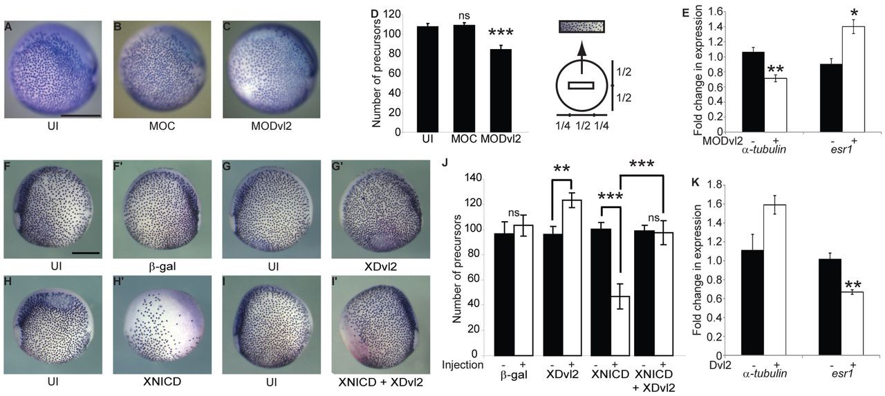 Fig. 2. Dishevelled regulates Notch-dependent cell fate decisions in vivo. (A-C) XDvl2 is required to regulate Notch signalling during development. Xenopus tropicalis embryos were injected at the one-cell stage with control morpholino (MOC) or one targeting Xdvl2 (MODvl2). Ciliated cell precursors were detected by α-tubulin expression (purple staining). (D) Precursors were counted within a box of standard area drawn over the centre of each embryo (see inset). Data are presented as mean number of precursors counted (±s.e.m.). Uninjected (UI) and MOC embryos were indistinguishable (A,B), whereas MODvl2 embryos exhibited a significant reduction in precursor number (C) (one-way ANOVA with Tukey's post-hoc tests). (E) qRT-PCR analysis of α-tubulin and esr1 expression in MOC and MODvl2 embryos. Expression was normalised to rpl8. Data are presented as mean fold change (±s.e.m.) in normalised expression values relative to uninjected embryos. esr1 expression was significantly increased in the MODvl2 embryos (two-tailed t-test, n=3). (F-Iâ²) XDvl2 expression inhibits endogenous Notch signalling and rescues the NICD gain-of-function phenotype. Xenopus laevis embryos were injected in one blastomere of the two-cell embryo with mRNA encoding β-gal (F,Fâ²), β-gal and XDvl2 (G,Gâ²), β-gal and XNICD (H,Hâ²), or β-gal, XNICD and XDvl2 (I,Iâ²). (J) Ciliated cell precursors were quantified as above (see D). X-Gal staining was performed to distinguish the injected side (pale red). Images of the uninjected and injected sides of the same embryo are shown. XDvl2 promoted (Gâ²) and XNICD inhibited (Hâ²) ciliated cell precursor specification (two-tailed paired t-test). XDvl2 completely rescued the XNICD phenotype (Iâ²) and there was no significant difference between the uninjected sides of any condition, and the β-gal or XNICD + XDvl2 expressing sides (two-way ANOVA and Bonferroni's post-hoc test). (K) qRT-PCR analysis of α-tubulin and esr1 expression in embryos expressing GFP or XDvl2 conducted as above (see E). esr1 expression was significantly decreased in XDvl2-expressing embryos (two-tailed t-test, n=3). Scale bars: 500 μm in A-C,F-Iâ². **P<0.01; ***P<0.001; ns, P>0.05. |
