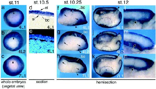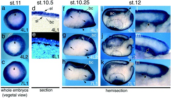 Fig. 2. Expression of Xenopus claudin-4L1, -4L2, and -7L1 genes in gastrula embryos. (aâc) Vegetal view of midgastrulae. (d,e) An animal pole area of sagittal section of early gastrula (-4L1) in bright field (d) and DAPI staining (e). The blastocoel was collapsed in this section. Sagittal hemisections of early gastrulae (fâh) or late gastrulae (iâk). (lân) Enlargement of upper part of the archenteron of iâk, respectively. ac, archenteron; bc, blastocoel; el, epithelial layer of ectoderm; sl, sensorial layer of ectoderm; arrowhead, blastopore; small arrows in fâh, mesodermal expression; large arrows in lân, expression in the archenteron roof; dotted line in iâk indicates the blastocoel. Developmental stages (st.) are shown above each column of pictures.