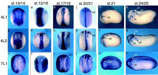 Fig. 3. Expression of Xenopus claudin-4L1, -4L2, and -7L1 genes in neurula to early tailbud stage embryos. (aâc) early neurula. (dâi) midneurula. (jâo) late neurula. (pâr) tailbud stage embryo. (aâl) dorsal view. Anterior is up. (mâr) lateral view. Anterior to the left. br, Branchial arch; ng, neural groove; op, otic placode; ov, otic vesicle; pn, pronephros.