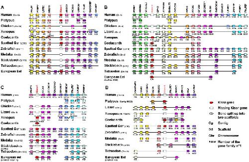 Figure 3. Conserved genomic synteny of osteichthyan Kissr.Genomic synteny maps comparing the orthologs of Kissr-1 (A), Kissr-2 (B), Kissr-3 (C), Kissr-4 (D) loci and their neighbouring genes. Analyses were performed on the genomes of human (Homo sapiens), platypus (Ornithorhynchus anatinus), lizard (Anolis carolinensis), chicken (Gallus gallus), xenopus (Xenopus (Silurana) tropicalis), coelacanth (Latimeria chalumnae), spotted gar (Lepisosteus oculatus), zebrafish (Danio rerio), medaka (Oryzias latipes), stickleback (Gasterosteus aculeatus), tetraodon (Tetraodon nigroviridis) and European eel (Anguilla anguilla). This map was established using the PhyloView of Genomicus v67.01 web site, manual annotation of European eel genome using CLC DNA Workbench 6 software and the gene annotation of the coelacanth and spotted gar genomic databases (see section 2). Kissr genes are named according to our proposed nomenclature (Kissr-1 to Kissr-4). The other genes are named after their human orthologs according to Human Genome Naming Consortium (HGNC). Orthologs of each gene are shown in the same color. Each of the eight conserved gene families is identified by an exponent number. The direction of arrows indicates the gene orientation, with the position of the gene (in 10−6 base pairs) indicated below. The full gene names and detailed genomic locations are given in Table S3.