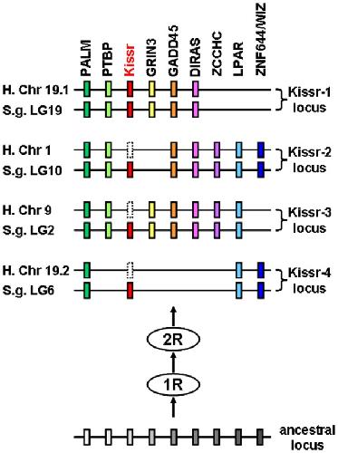 Figure 4. Proposed origin of osteichthyans Kissr loci based on human and spotted gar Kissr tetra-paralogons.The paralogous genes of each of the eight identified families delineate four tetra-paralogons in both human and spotted gar. This suggests a common origin of the four loci before the two whole genome duplication rounds (1R and 2R) occurred in the early vertebrate history.