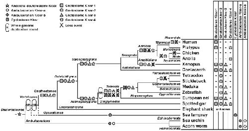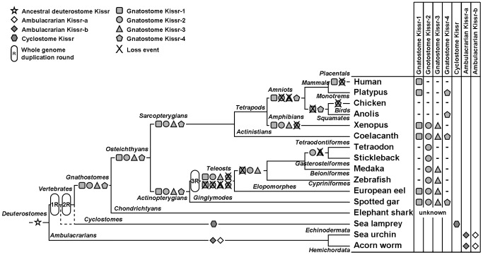 Figure 5. Current status and proposed evolutionary history of Kissr family.This representation is based on the phylogenetic and synteny analyses. The names of the main phyla are given on the corresponding branches. The names of the current representative species of each phylum are given at the end of the final branches, together with the symbol of the Kissr gene they possess. This hypothesis assumes the presence of the four Kissr paralogs in the osteichthyan lineage resulting from the two rounds of vertebrate whole genome duplication. Multiple subsequent Kissr gene loss events are indicated in the actinopterygian and sarcopterygian lineages.