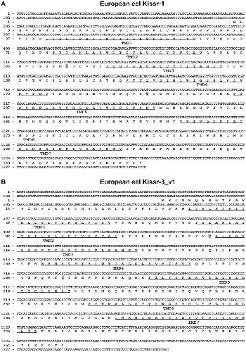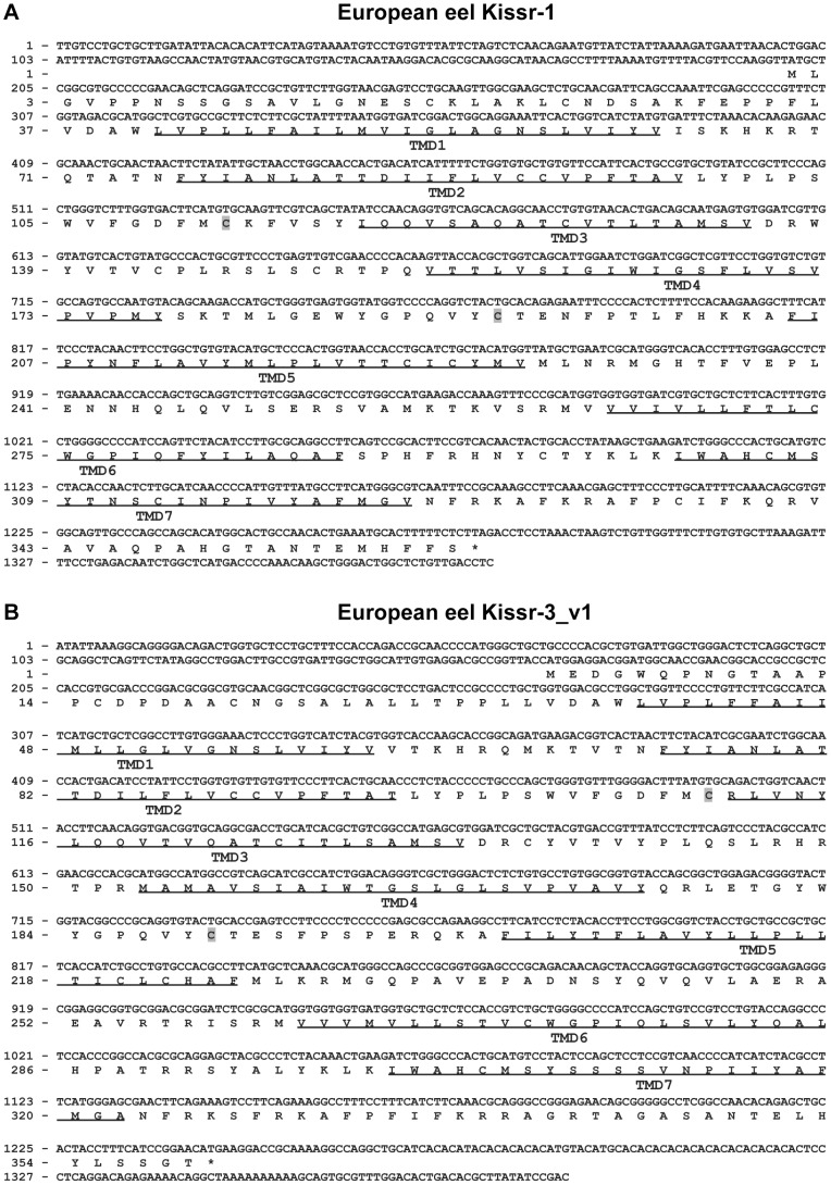 Figure 1. Molecular cloning of eel Kissr-1 and Kissr-3_v1.Nucleotide and deduced amino-acid sequence of the cDNA encoding the eel Kissr-1 (A) and Kissr-3_v1 (B). Nucleotides (top) are numbered from 5′ to 3′. The amino-acid residues (bottom) are numbered beginning with the first methionine residue in the ORF. The asterisk (*) indicates the stop codon. The predicted seven transmembrane domains (TMD) are underlined and the cysteines involved in a disulphide bridge are shaded in grey.