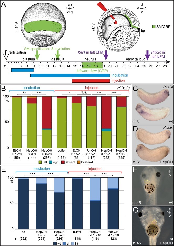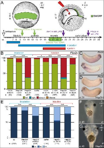 Fig. 1. Neurula stage embryos require GJC for LR development. (A) Scheme depicting type and time course of treatments. (B) HepOH treatments of neurula stage embryos resulted in absence of Pitx2c expression in the left LPM of 2-day tadpoles. (B) Summary of experimental data. (C,D) Representative wildtype (C) and HepOH-treated (D) embryos displaying left-asymmetric (C) or absent (D) expression of Pitx2c in the left LPM. (E) Consequences of treatments for situs development in the 3-day tadpole. (E) Summary of results. (F,G) Characteristic untreated (F) and HepOH-incubated (G) tadpoles displaying normal organ situs (F) or situs inversion (G), as determined by the direction of heart looping (outlined by dashed yellow line) and gut coiling (outlined in black). Note that ethanol and undecanol were inefficient. Note also that early treatments before gastrulation (≤ stage 9) and late injections (stage 19/20) were less striking or without effect. a, anterior; an, animal; d, dorsal; EtOH, ethanol; HepOH, HepOH; ht, heterotaxia; n.s., not significant; p, posterior; si, situs inversus; st., stage; UnOH, undecanol; v, ventral; veg, vegetal; wt, wildtype; *, significant (p<0.05); **, highly significant (p<0.01); *** very highly significant (p<0.001). Numbers in brackets represent number of analyzed specimens. Statistical significances were calculated using Pearson's chi square test. |