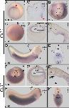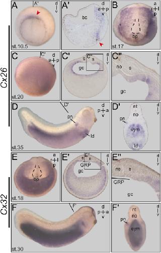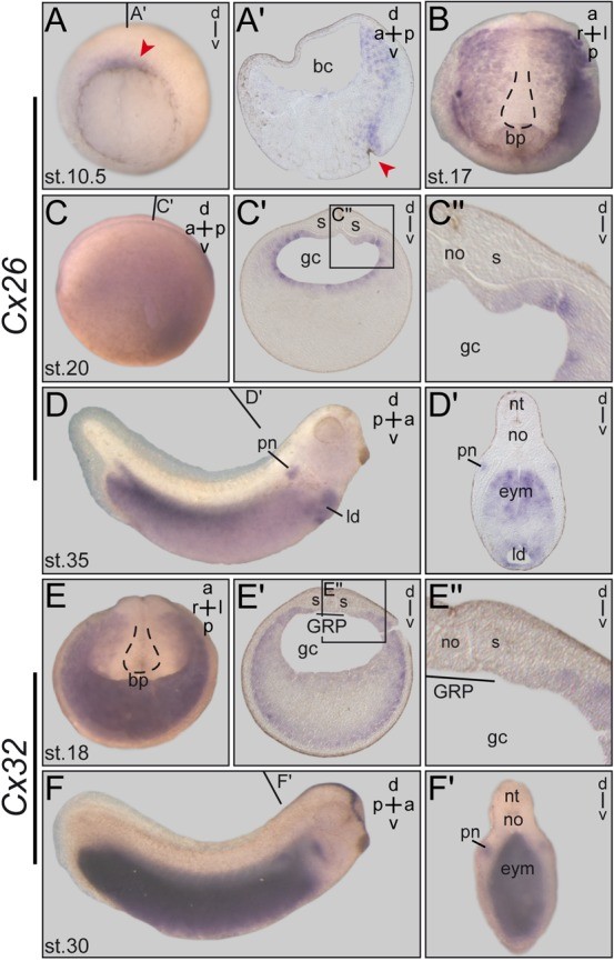 Fig 2. Cx26 and Cx32 are co-expressed in the epithelial lining of the gastrocoel next to the GRP. Temporal and spatial expression patterns were determined by WMISH of staged embryos. (A) Cx26. (A) In the early gastrula embryo Cx26 expression around the blastopore is enhanced on the dorsal side (arrowhead). (Aâ²) Histological section shows Cx26 staining in the involuting endodermal cells. (B,C) In the stage 17 neurula embryo Cx26 mRNA is found in the endoderm lining the gastrocoel. (B) Dorsal explant. Outline of GRP, which is free of staining, indicated by dashed line. (C) Sectioning (Câ²) of whole-mount embryo (C) shows Cx26 expression all around the gastrocoel with the marked exception of the GRP, demonstrated in blowup shown in (Câ²). (D) Cx26 expression at stage 35. Transversal section (Dâ²) shows staining in the pronephros, the liver diverticulum and in the dorsal half of the endoderm. (E,F) Cx32. (E) Expression in posterior half of stage 18 neurula embryo. Section in (Eâ²) demonstrates staining in two open ring-like domains representing the limit of the endoderm, compassing the endodermal yolk cells. Blowup in (Eâ²) shows that the GRP is free of Cx32 expression. (F) Cx32 expression at stage 30. Transversal hemisection in (Fâ²) reveals mRNA staining in the pronephros, hatching gland and throughout the endoderm. a, anterior; bc, blastocoel; bp, blastopore; d, dorsal; eym, endodermal yolk mass; gc, gastrocoel; l, left; ld, liver diverticulum; no, notochord; nt, neural tube; p, posterior; pn, pronephros; r, right;s, somite; st., stage; v, ventral. The position of the GRP is indicated by dashed lines in (B) and (E). Red arrowheads mark the position of the blastopore in (A,Aâ²). Lines in (C,D,F) indicate planes of histological sections in (Câ²,Dâ²,Fâ²). |