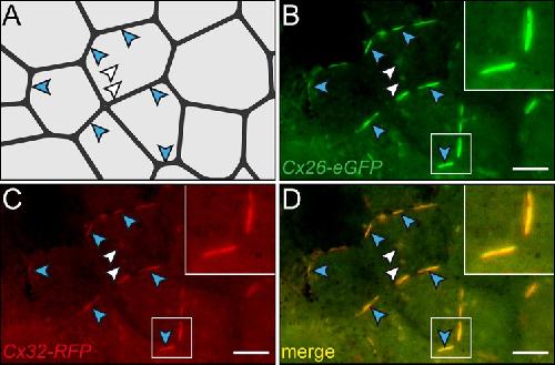 Fig 3. Cx26 and Cx32 form heteromeric connexons in Xenopus embryos. Fusion constructs (Cx26-eGFP and Cx32-RFP) were co-injected into the animal region of single blastomeres at the 4-8 cell stage and cultured through blastula-gastrula stages. Fluorescent fusion proteins were co-expressed in ectodermal cells of the animal cap region. Expression was found in vesicles (white arrowheads) and the plasma membrane (blue arrowheads). (A) Cell boundaries. Positions highlighted in (B) are indicated by arrowheads. (B) Cx26-eGFP staining. (C) Cx32-RFP staining. (D) Overlay of frames. Scale bar represents 10 . |