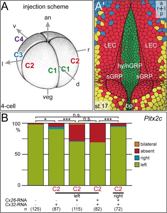 Fig 4. Overexpression of Cx26 but not Cx32 impairs LR development. Full-length expression constructs were injected alone or in combination into single left or right blastomeres of the 4-8 cell embryos, and Pitx2c expression was analyzed in the 2-day tadpole. (A,A′) Injection scheme and cell lineage at stage 17. (A) Injections were targeted to the C2 lineage, i.e. cells which during flow stages (st. 17; A′) end up in the marginal cells of the GRP (somitic GRP; sGRP) and the adjacent lateral endodermal crest cells (LEC). (B) Summary of results. Note that right-sided injections did not alter Pitx2c expression. Note also that left-sided Cx26 overexpression prevented Pitx2c induction in the left LPM with very high statistical significance, while Cx32 had no effect on laterality, whether applied alone or in combination with Cx26. Numbers in brackets represent number of embryos analyzed. Statistical significances were calculated using Pearson's chi square test. |
