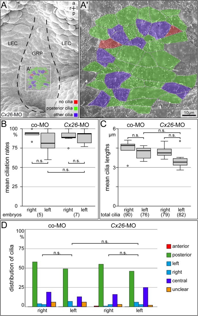 Fig 6. GRP morphology and ciliation are unaffected in Cx26 morphants. SEM-analysis of GRP ciliation and morphology in stage 17 dorsal explants of morphants injected with Cx26-MO or Co-MO into left blastomeres at the 4-cell stage. (A) Representative dorsal explant of Cx26 morphant specimen revealed normal cilia length, number of ciliated cells and cilia polarization. (B) Quantification of mean ciliation rates (B) and mean cilia lengths (C) of GRP cilia in a defined area (A′). (D) Cilia polarization (assessed in the same areas). Note that a not significant (n.s.) slight tendency towards fewer and shorter cilia was observed on the injected side in both Cx26 and co-MO morphants, but that differences between Cx26 morphants and co-MO injected specimens were not significant. Numbers in brackets indicate number of analyzed dorsal explants or cilia. Statistical significances were calculated using Student's t-test. |