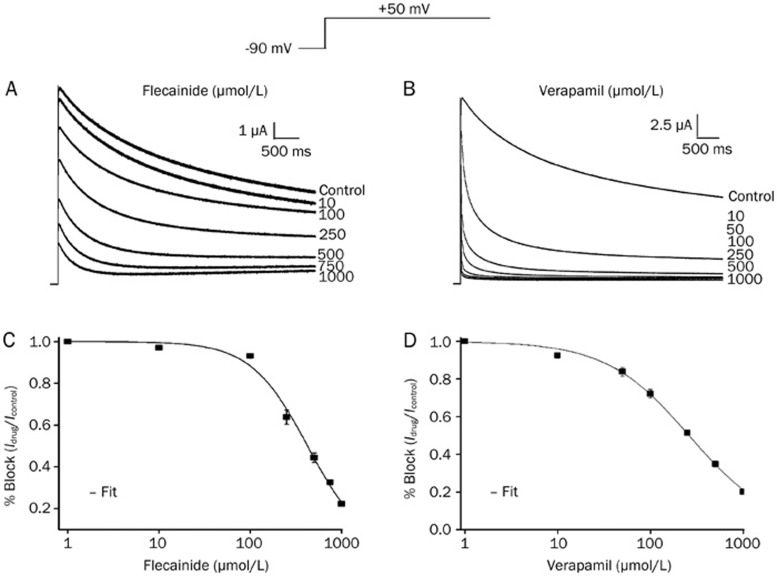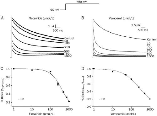 Figure 2. Concentration-response relationships for the inhibition of the fKv1.4ΔN currents by flecainide and verapamil. (A and B) Representative current traces were elicited in the absence and presence of increasing concentrations of flecainide (A) or verapamil (B). Currents were recorded by depolarizing steps to +50 mV from a holding potential of −90 mV. (C and D) The peak currents were normalized to the maximum peak current under control conditions and plotted against flecainide (C) and verapamil (D) concentrations. The curves were derived by fitting data to the Hill equation. Symbols and error bar are mean±SEM (n=5).