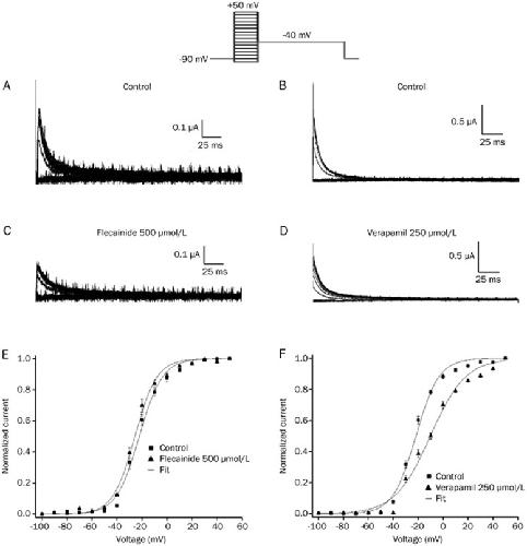 Figure 4. Effects of flecainide and verapamil on the activation of the fKv1.4ΔN currents. (A–D) Current traces were obtained by applying 80 ms steps to potentials ranging from −100 to +50 mV and were followed by the tail currents obtained upon repolarization to −40 mV in the absence (A and B) and presence of 500 μmol/L flecainide (C) or 250 μmol/L verapamil (D). (E and F) Peak current activation relationships in the absence and presence of 500 μmol/L flecainide (E) and 250 μmol/L verapamil (F). The steady-state activation curves were depicted by plotting the peak tail currents (obtained at −40 mV) against the depolarizing potentials (from −100 to +50 mV). Continuous lines represent the fit of the data to a Boltzmann equation: f=1/{1+exp*[(V–V1/2)/k)]}. Average data are shown as mean±SEM (n=5).