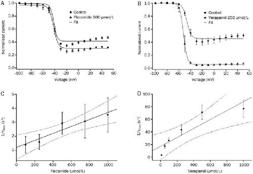 Figure 5. Changes in the inactivation kinetic properties of the fKv1.4ΔN currents by flecainide and verapamil. (A and B) Steady-state inactivation was studied using a two-step voltage protocol, currents were measured at +50 mV, and the 5 s pre-steps to potential varied from −100 to +50 mV in steps of 10 mV. The curves for steady-state inactivation were fitted with the Boltzmann equation: I/Imax=(1−α)/{1+exp*[(V−V1/2)/k)]}+α. (C and D) Time constant of inhibition as a function of the drug concentration. Time constants (τblock) were estimated from a single or double exponential fits to the tracings shown in Figure 1. The apparent rate constants for association (k+1) and dissociation (k-1) were obtained from the equation: 1/τblock=k+1[d]+k−1 (n=5). Data are shown as mean±SEM (n=5).