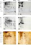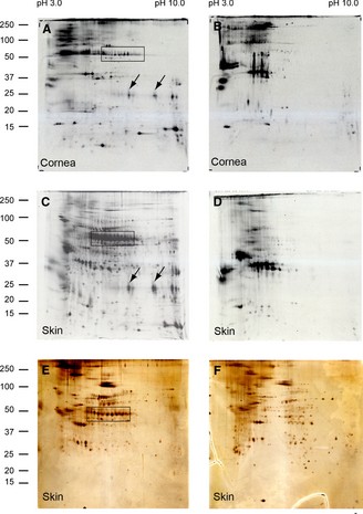 Figure 2. Two-dimensional gel autoradiographs of 35S-labelled proteins in media conditioned by cornea and skin explants after culture in matrigel for 4 days in the absence (A and C) or presence (B and D) of ActD. The silver-stained gels corresponding to C and D are also shown (E and F, respectively). Many spots in A and C are absent in B and D, indicating that synthesis and release of these proteins depend on RNA synthesis during culture. These include a charge train of proteins of approximately 50 kDa, present in A and C (boxed areas) and clearly visible with silver staining in E, but absent in B, D and F. Two other proteins of approximately 25 kDa (arrows) are present in A and C (although not visible with silver staining in E), but are absent in B and D. |