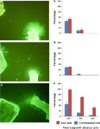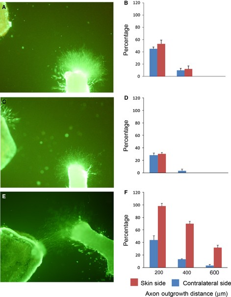 Figure 5. Directed axonal growth requires MMP activity. In the presence of 1 μm BB-94 BB-94 (A) or 25 μm GM6001 (C), axonal outgrowth from the ends of peripheral nerves occurred but was not directed towards skin explants (left side of the panels), although this did occur in control cultures (E) containing vehicle [0.1% dimethylsulphoxide (DMSO)]. The mean proportions (standard error of the mean) of axons (expressed as percentages of the numbers initially growing from the cut end of the peripheral nerve in three independent experiments) extending to different distances on the side adjacent to skin as compared with the contralateral side are also shown. In the presence of BB-94 (B) and GM6001 (D), the differences were not significant. By contrast, in the presence of DMSO (F), the differences were significant at 200 μm, 400 μm and 600 μm (P < 0.005, P < 0.001 and P < 0.005, respectively). |