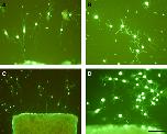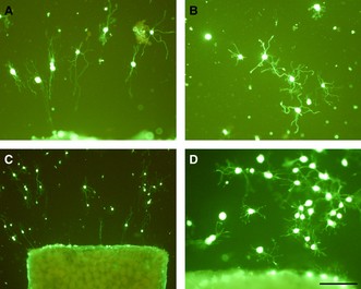 Figure 7. The orientation of neurite outgrowth from dissociated DRG neurons is influenced by diffusible factor(s). After 3 days in culture, the orientation of neurite outgrowth of neurons on a layer of collagen was orthogonal to adjacent skin explants (towards the bottom of each panel) in an underlying layer of matrigel (A) or lamininidogen gel (C), but generally not at distances > 500 μm (B). In the presence of batimastat, the orientation of neurite outgrowth was not influenced by skin explants, and neurite lengths were shorter (D). Scale bar: 100 μm in A, B and D; 250 μm in C. |