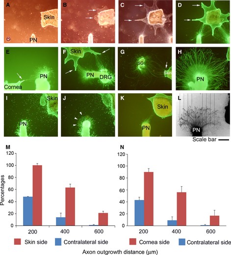 Figure 1. Regenerating axons grow towards epithelial cells migrating from skin explants in matrigel. Dark field images show cell migration from a skin explant and axonal outgrowth from the end of a peripheral nerve (PN) after (A) 1 day, (B) 2 days and (C) 3 days in culture. (D) Calcein-labelled image at 3 days. Axonal outgrowth increased rapidly after 2 days, and by 3 days had reached the migrating epithelial cells (arrows). C and D are of a slightly different field to A and B, to include axons from an adjacent PN-DRG growing towards the skin explant. Regenerating axons converged on the leading fronts of migrating cells from explants of cornea (E) and skin (F). Sympathetic ganglia (SG) axons also showed striking convergent axonal growth towards a skin explant (G). Axonal growth was attracted towards skin explants even in the presence of NT-4. Initial axon outgrowth from a PN-DRG preparation was radial, but, approximately 500 μm from the skin explant, axons began to grow towards a small area of migrating cells (H). Axonal growth towards skin explants also depends on gel composition. After 3 days culture in a fibrin gel, a PN-DRG showed some cell migration but no axonal outgrowth towards a skin explant (I), although abundant axonal outgrowth (arrows) occurred 1 day after addition of BDNF (J). In lamininidogen complex gels, directed axonal outgrowth towards skin explants occurred within 3 days (K). Bar: 500 μm in A and H; 1000 μm in G. To quantify the effects of skin and cornea on axonal growth from PN-DRGs, calcein-AM fluorescence images were first inverted to facilitate visualization of individual axons (L). Lines were then drawn on either side and parallel to the end of the cut peripheral nerve, and the proportions of axons extending 200 μm, 400 μm and 600 μm from the end of the nerve were determined as percentages of the numbers of axons initially growing from the end of the nerve on both sides. The lower panels show percentages of axons (as proportions of the numbers initially growing from the cut end of the peripheral nerve) extending laterally to different distances on the side next to the skin (M) or cornea (N) as compared with the opposite side (three experiments). In M, the differences are significant at 200 μm, 400 μm and 600 μm (P < 0.001, P < 0.01 and P < 0.001, respectively), and in N they are significant at 200 μm and 400 μm (P < 0.005 and P < 0.02, respectively). |
