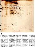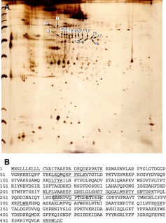 Figure 3. (A) Silver-stained two-dimensional gel of proteins in media conditioned by Xenopus froglet skin explants cultured in matrigel for 4 days, showing the spots from the approximately 50-kDa charge train picked for analysis of PTMs by LC-MS/MS after initial identification of spots 4, 5, 8, 9, 10, 11 and 12 as pro-MMP-18. (B) LC-MS/MS sequence coverage for pro-MMP-18. The derived sequence is shown in plain type, and peptides not covered by LC-MS/MS are underlined. The O-linked glycosylation domain is shown boxed, and possible residues for glycosylation within this are shown in bold type. |