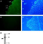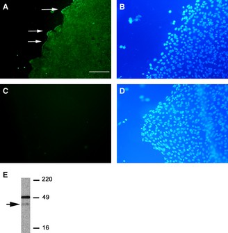 Figure 4. Migrating epithelial cells express MMP-18. Tadpole skin explants were cultured for 3 days in matrigel and viewed under fluorescence for MMP-18 immunoreactivity (A) or stained with 4′,6-diamidino-2-phenylindole to label cell nuclei (B and D). MMP-18 labelling was marked at the leading edge of the cells, where they had migrated furthest (arrows). (C) Background fluorescence in a preparation in which the primary antibody was omitted. Bar: 100 μm. (E) Western blot showing pro-MMP-18 (approximately 49 kDa) and a much fainter band corresponding to mature MMP-18 (arrow) in media conditioned by tadpole skin explants cultured in matrigel for 4 days. |