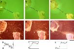 Figure 6. Fluorescence and dark field (upper and middle panels, respectively) images of a nodose ganglion and skin explant co-cultured in matrigel containing DQ gelatin, showing onset of axonal growth in relation to MMP activity. Fluorescence around the edges of the skin explants increased in intensity and extent from day 1 (A, D) to day 3 (C, F). No specific fluorescence was seen when DQ gelatin was omitted from the matrigel (data not shown). Plots of changes in fluorescence intensity (in arbitrary units) along a line between the skin and ganglion (dots) are shown in the lower panels. Axonal growth was already predominantly oriented (arrow in E) towards the skin explant on day 2, although the zone of MMP activity (B) had not yet extended to the tips of the growing axons. By day 3, axons had continued to extend through the area of MMP activity to make contact with migrating cells from the skin explants (F). Bar: 200 μm. |