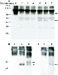 Figure 9. (A) Western blots demonstrating nidogen cleavage by MMPs released from cultured skin and cornea. In lane 1, where freshly diluted matrigel (100 ng) was applied, there are several high molecular mass bands (> 80 kDa), but no smaller breakdown products are visible. By contrast, in lanes 2, containing media conditioned by polymerized matrigel without (lanes 2) or with (lanes 5) Xenopus skin explants for 3 days, there are several lower molecular mass bands (280 kDa), and fragments of 50 kDa and 90 kDa (arrows) are observed in samples incubated with Xenopus skin explants (lanes 5 and 6), but are absent from BB-94-treated cultures (lane 7). In lanes 2/5 and 3/6, samples are from two independent experiments. (B) Media conditioned by lamininidogen gels containing skin explants (lanes 1 and 2) or cornea explants (lane 3). Note the absence of the 50-kDa band (arrow) in CM from a BB-94-treated culture (lane 1). In media conditioned by cornea in lamininidogen complex gels, there is an additional nidogen fragment of 57 kDa, marked by an arrowhead. (C) Diluted lamininidogen complex (100 ng/μL) incubated with cell culture supernatants from COS7 cells transfected with empty vector (lane 1) or an MMP-18 expression vector (lane 2). The arrow marks the position of the cleaved nidogen band (50 kDa). |