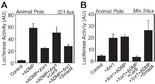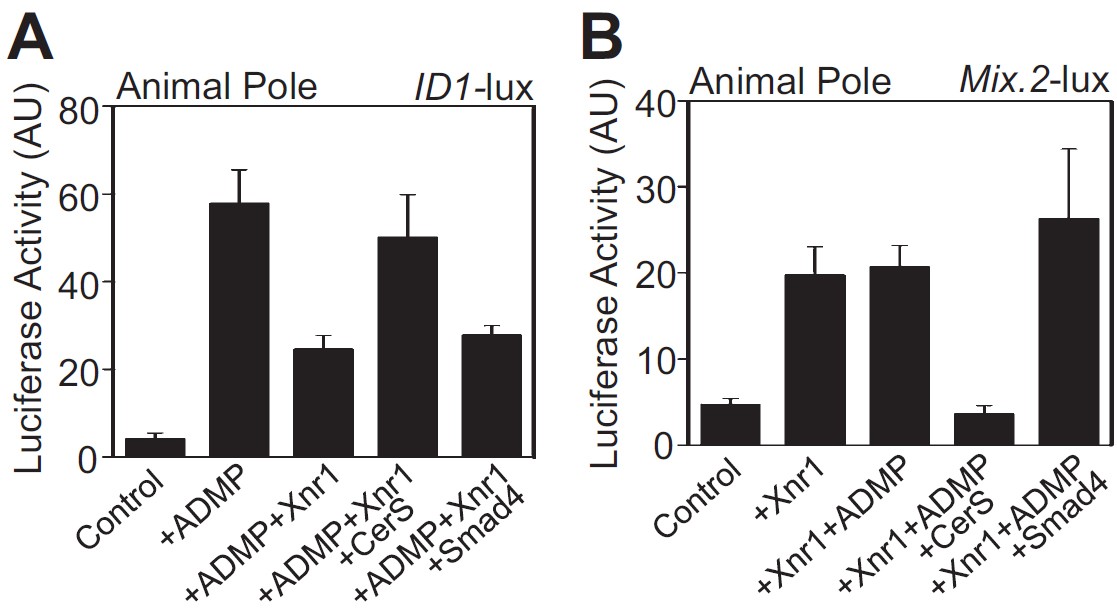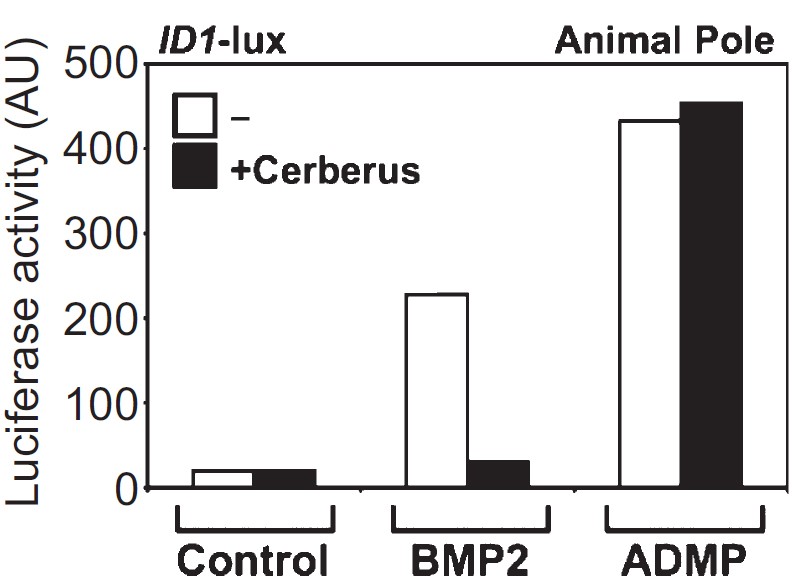 were injected in the animal pole with ID1-luciferase reporter alone (Control) or in combination with a suboptimal dose of ADMP mRNA (10 pg/embryo).