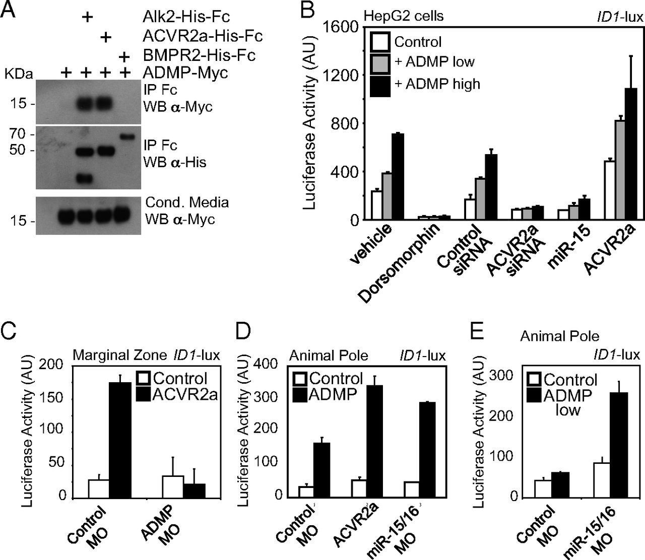 were coinjected with control or ADMP morpholinos. In D, embryos were injected in the animal pole with ID1-luciferase reporter alone (Control) or in