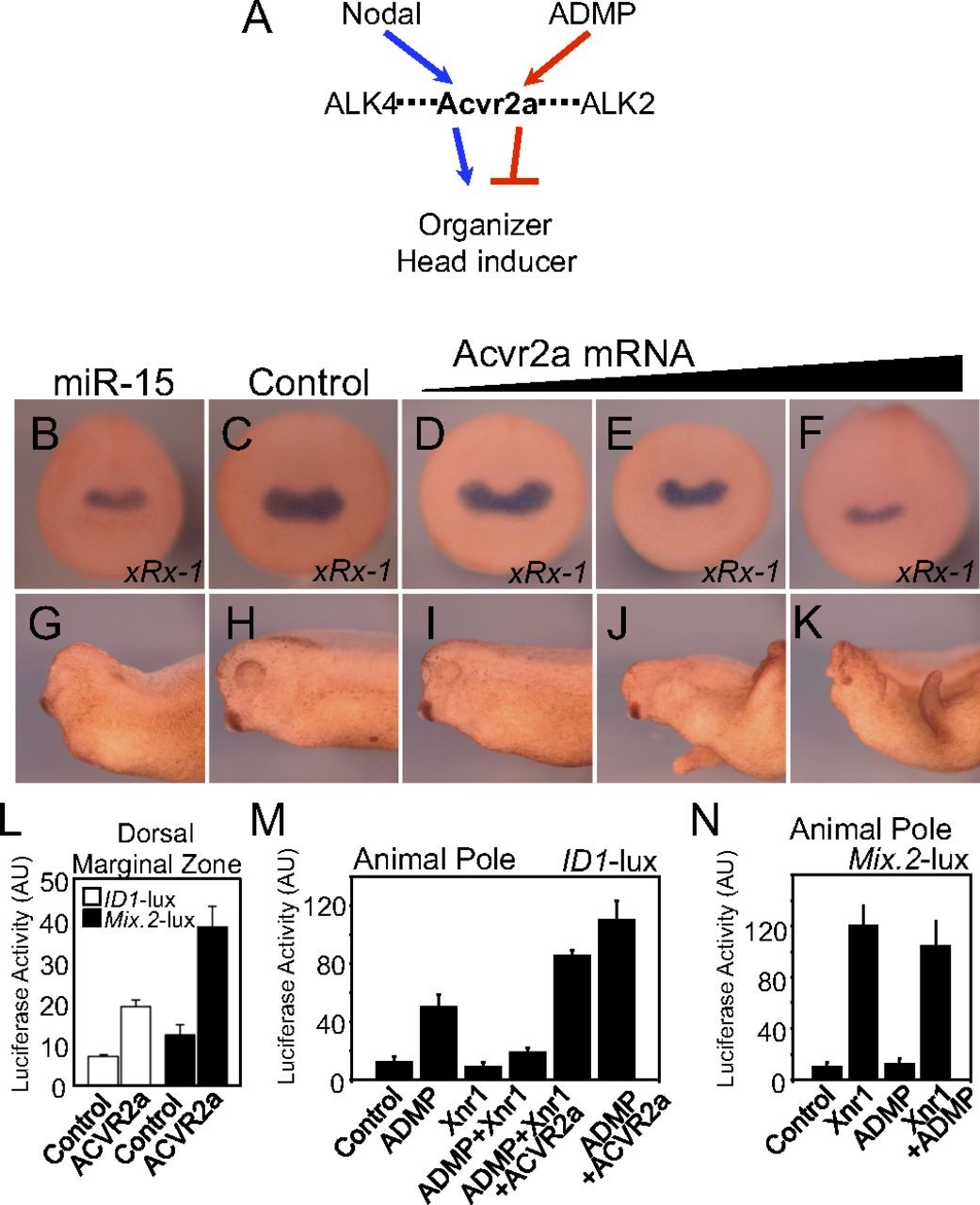 (15 ng/embryo) or ACVR2a mRNA (10, 100, or 300 pg/embryo). (B) Neurula-stage embryos were stained for xRx-1. (G) Close up picture of anterior/head region of sibling embryos of B, grown until tadpole stage (stage 37). Pictures are the representatives of >20 embryos from two independent experiments. Frequency of the shown phenotype was >80%. (L) Dorsal overexpression of ACVR2a increases both ADMP- and Nodal-dependent transcriptional activity. Embryos were injected in the dorsal marginal zone with either ID1-luciferase reporter or Mix.2 luciferase reporter with or without AVCR2a (300 pg) mRNA. Targeting to dorsal mesoderm was confirmed at gastrula by coinjected GFP mRNA. Data are given as mean and SD. (M) Overexpression of Xnr1 outcompetes ADMP if ACVR2a levels are limiting. Embryos were injected in the animal pole with the ADMP-responsive ID1-luciferase reporter alone (control) or with combinations of ADMP (100