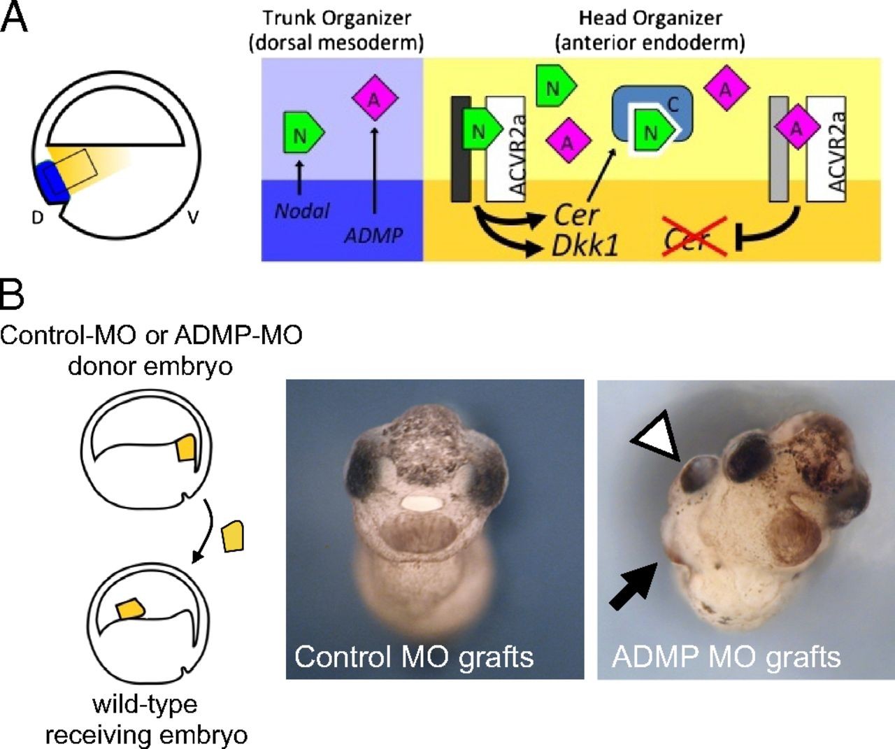 anterior endoderm. (A) Simplified scheme depicting the molecular interactions between Nodal, ADMP, and ACVR2a. (Left) In a Xenopus gastrula, the organizer is formed of dorsal mesodermal cells (blue), and of the abutting anterior endoderm (yellow expressing head-inducing molecules. D, dorsal; V, ventral. The expression pattern of ADMP, Cerberus, Dkk, Nodals, and ACVR2a has been previously described (6, 14, 17, 22, 27). Right, corresponding to the boxed region on the Left, depicts a model for the interplay between Nodal, ADMP, and Nodal antagonists. Darker and lighter backgrounds correspond to the intracellular and extracellular space, respectively. Nodal signals through ACVR2a and activates the expression of head inducers, such as Cerberus and Dkk-1. Cerberus secretion limits Nodal diffusion, enabling ADMP signaling, that, in turn, feedbacks on the expression of head inducers, including Cerberus itself. N, Nodal; A, ADMP; C, Cerberus. Italicized names indicate gene transcription. (B) Anterior endoderm explants dissected from early gastrula embryos (stage 10.5) injected with control or ADMP morpholinos were transplanted into the blastocoel of wild-type recipient embryos (Einsteck grafts). Recipient embryos were allowed to develop until tadpole stage, when they were scored for the presence of ectopic head structures (white arrowheads, cement glands; black arrows, eyes). Percentage of induced heads: control, MO-injected grafts, 0/40; ADMP, MO-injected grafts, 5/30. |