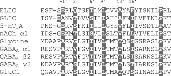 Fig. 1. An alignment of channel-lining residues for a range of eukaryotic Cys-loop receptors and prokaryotic homologues. As is common for these receptors, a prime notation is used to facilitate comparison between different subunits, with 0′ being the conserved charged residue at the start of M2. Grey indicates residue conservation. Accession numbers are: ELIC P0C7B7, GLIC Q7NDN8, 5-HT3P46098, nACh α1 P02708, Gly P23415, GABAA α1 P14867, GABAA β2 P47870, GABAA γ2 P18507, GluCl Q94900.