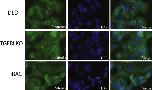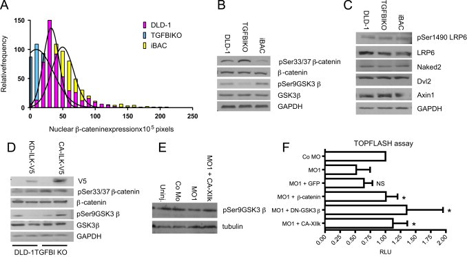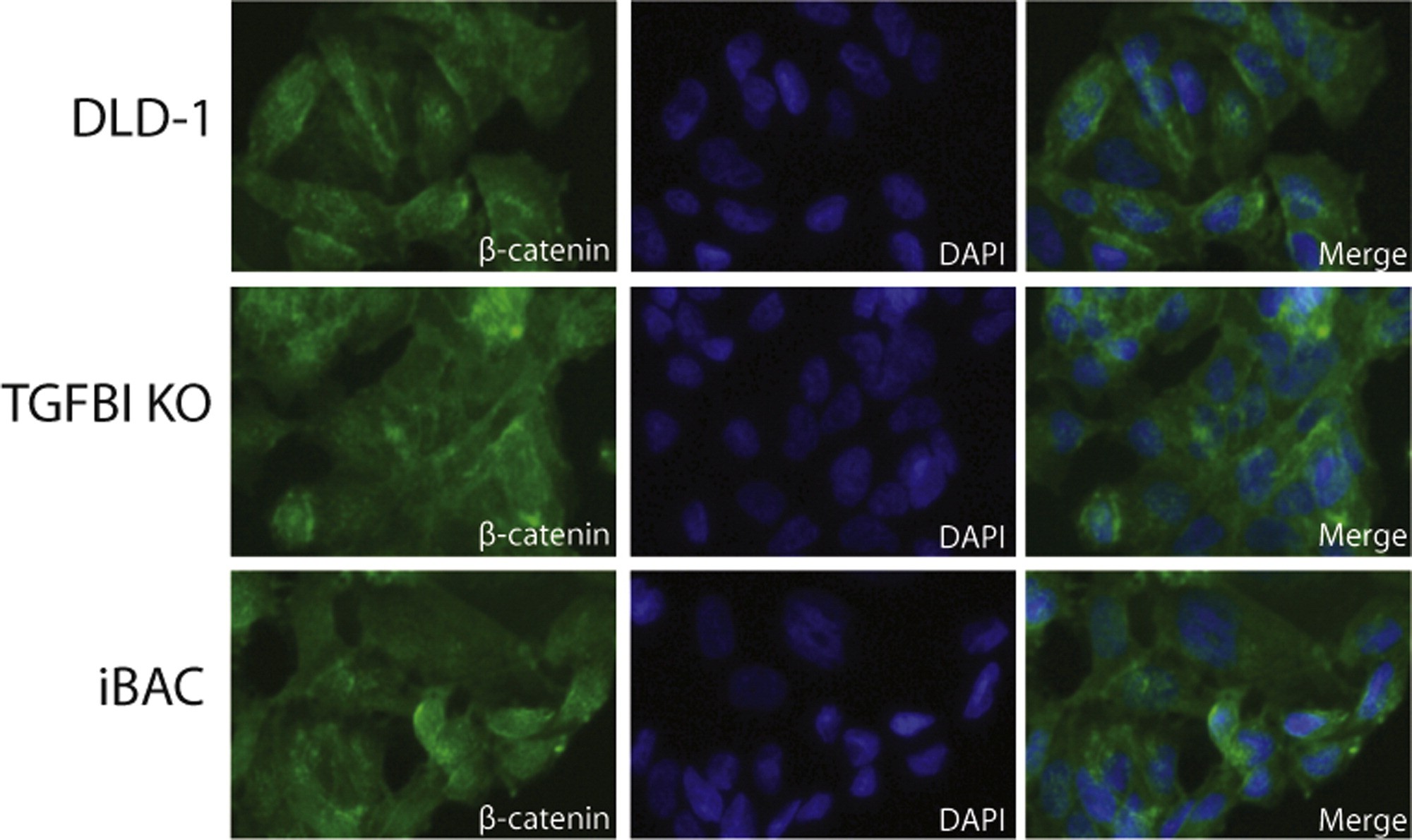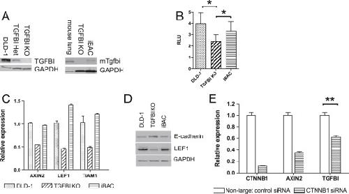 Fig. 6. Tgfbi was required to augment Wnt activity in DLD-1 cells. (A) Western blot of Tgfbi and mTgfbi in DLD-1, Tgfbi het (Tgfbi+/â-DLD-1), TGFBI KO (Tgfbiâ/â DLD-1) and iBAC (mTgfbi BAC-carrying Tgfbiâ/â-DLD-1) cell lines. GAPDH was used as a loading control. (B) A representative TOPFLASH assay in DLD-1, TGFBI KO, and iBAC cells. Tgfbi deletion reduced endogenous Wnt activity in DLD-1 cells (P=0.030), which was restored in iBAC cells (P=0.038). The data were analyzed with unpaired two-tailed Student T test. (C) A representative experiment showing expression of Wnt-responsive genes measured by real-time RT-PCR. (D) Western blot analysis in DLD-1, TGFBI KO and iBAC cells. Loss of Tgfbi promoted E-cadherin expression but suppressed expression of LEF1. (E) A representative experiment showing expression of CTNB, AXIN2 and Tgfbi measured by real-time RT-PCR following β-catenin knockdown. The data were analyzed by unpaired two-tailed Student T test (P< 0.001) |