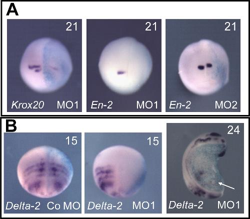 Supplementary Fig. 1. XTgfbi depletion disrupts neural plate AP patterning. In situ hybridization of neural plate AP-patterning genes in morpholino-injected embryos. (A) The expression of mid and posterior markers Krox20, En2 are reduced or posteriorized in XTgfbi-depleted embryos. (B) The expression of Delta-2 is significantly reduced in XTgfbi-depleted embryos. |