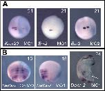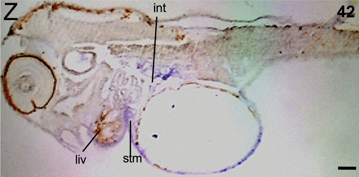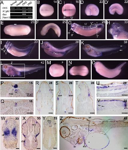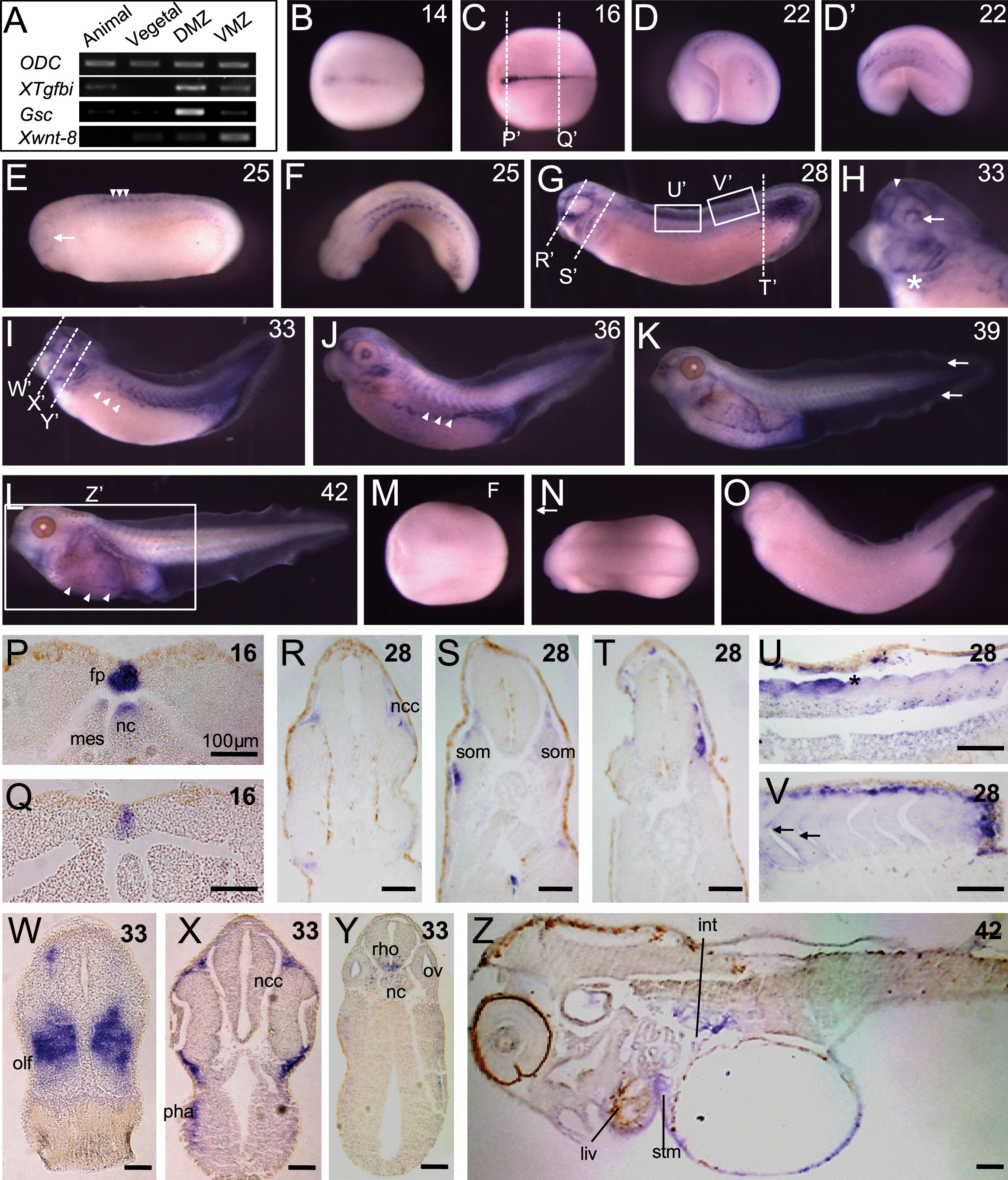 Fig. 2. Expression pattern of XTgfbi. (A) RT-PCR shows, in stage 10 embryos, XTgfbi was strongly expressed in DMZ and weakly expressed in VMZ and animal cap. Gsc and Xwnt-8 are markers for DMZ and VMZ, respectively. (B) Whole mount in situ hybridization of XTgfbi. Dashed lines indicate the position of transversal sections as labelled. (B) Dorsal view (rostral to the left) at stage 14. XTgfbi was weakly expressed in the dorsal midline. (C) Dorsal view at stage 16 showing a decreasing XTgfbi expression gradient in the dorsal midline. (D, D') Lateral and dorsal views at stage 22: XTgfbi expression was seen in the dorsal tips of developing somites. (E, F) Lateral and dorsal views at stage 25: XTgfbi was expressed in dorsal somite tips (arrowheads), weakly in tissues surrounding the eye (arrow). (G) Lateral view at stage 28: XTgfbi was expressed in intersomitic boundaries, around the eye, migrating cranial neural crests and tailbud. (H) Lateral view of embryo head at stage 33: XTgfbi expression was prominent in CNS (arrowhead), eye (arrow) and pitpharyngeal pouches (asterisk). (I) Side view at stage 33 showing strong expression in the somites, tailbud and migrating hypaxial muscle anlagen (arrowheads). (J) Lateral view at stage-36: XTgfbi expression is prominent in the migrating hypaxial muscle (arrowheads), eye and tail fin. (K) Lateral view at stage 39: XTgfbi is detected in migrating hypaxial muscle and tail fin (arrows). (L) Lateral view at stage 42: XTgfbi is expressed in ventral side of the embryo and migrating hypaxial muscle (arrowheads). (M, N, O) In situ hybridization with sense XTgfbi probe shows no specific staining. (P, Q) Transversal sections from C: XTgfbi was strongly expressed in the floor plateand notochord. (R, S, T) Transversal sections from G: XTgfbi was expressed in neural crest cells and somites. (U, V) Parasagittal sections from G: XTgfbi expression is in the somites, strong in the dorsal tips (asterisk) and intersomitic boundaries (arrowheads). (W) Transversal sections from I: XTgfbi expression is in olfactory pits, periphery of prosencephalon, migrating neural crests, pharyngeal pouches as well as rhombencephalon, otic vesicles and notochord. (Z) Sagittal section from L showing XTgfbi expression in tissues surrounding various internal organs and abdominal epithelia. fp, floor plate; int, intestine; liv, liver; mes, mesenchyme; nc, notochord; ncc, neural crest cell; olf, olfactory pit; ov, otic vesicle; pha, pharygneal pouch; rho, rhombencephalon; som, somite; stm, stomach. Scale bar=100 m. |