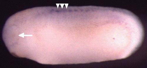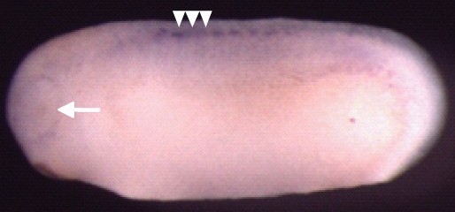 tgfbi ( transforming growth factor, beta-induced, 68kDa ) gene expression in Xenopus laevis embryos, NF stage 14, as assayed by in situ hybridization. dorsal view: anterior left. |