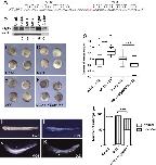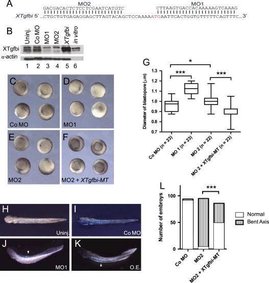 Fig. 3. XTgfbi depletion affected multiple tissue development. (A) Sequence and alignment of XTgfbi morpholinos. (B) XTgfbi morpholino (34 ng), or XTgfbi mRNA (2 ng) was injected into the DMZ of both cells at 2-cell-stage. XTgfbi protein levels in stage-32 embryos were analyzed by Western blotting using the XTgfbi antibody. Lane 6, in vitro translated XTgfbi as a positive control. (CâG) Effects on blastopore closure. CâF: Vegetal views of representitive stage-10.5 embryos injected with the indicated reagents. G: Quantification of blastopore size, analyzed with unpaired two-tailed Student T test. Both MO1(P<0.001) and MO2 (P=0.197) injection delayed blastopore formation compared with control. XTgfbi-MTco-injection rescued the defects (P<0.001). (H, I, J, K) Side views ofstage-32 embryos unilaterally injected with XTgfbi MO1 (34 ng) or mRNA (2 ng) at two-cell stage. (L) Graph shows XTgfbi-MT injection partially rescued the bent axis phenotypes caused by XTgfbi depletion. The data were analyzed by Chi square and (Fisherâs exact) test (P<0.001). |
