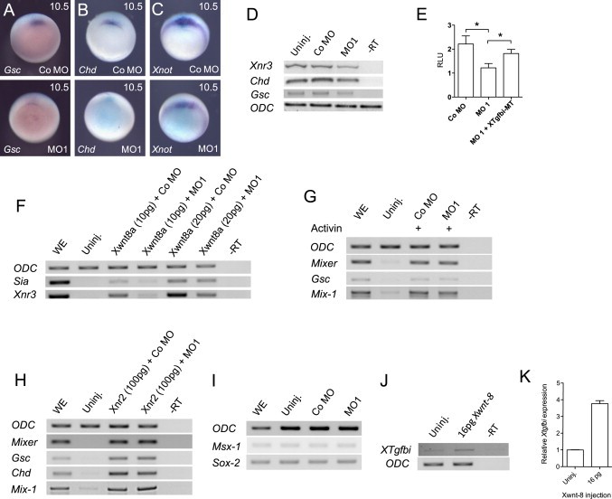 Fig. 5. XTgfbi was required for the full activation of canonical Wnt signalling in Xenopus. (A, B, C) In situ hybridization of organizer genes in morpholino-injected embryos. XTgfbi depletion suppressed expression Gsc, Chd, and Xnot. (D) RT-PCR showed Wnt target gene expression was repressed by XTgfbi depletion. The indicated reagents were injected at 2-cell stage and analyzed in whole embryos at stage 10.5. (E) A representative TOPFLASH assay in stage-10.5 embryos injected with CoMO, MO1 and MO1 with XTgfbi-MT at two-cell stage. The data were analyzed with unpaired two-tailed Student T test (P=0.030, 0.037 respectively). (F) RT-PCR showed the exogenously induced Wnt target gene expression was repressed by XTgfbi knockdown in the animal cap assay. Embryos were injected with the indicated constructs at two-cell stage. Animal caps were dissected out at stage 8 and harvested at stage 10. (G, H) Exogenously induced target gene expression downstream of Nodal/Activin pathway was not affected by XTgfbi depletion. Embryos were injected at two-cell stage with indicated constructs. Animal caps were (G) isolated at stage 8, treated with activin at 10 ng/ml and harvested at stage 11, or (H) isolated at stage 9 and harvested at stage 11. (I) RT-PCR showed XTgfbi depletion does not affect the BMP pathway target gene expression. Embryos were injected at two-cell stage. Animal caps were isolated at stage 8 and harvested at stage 11. (J) RT-PCR showed Xwnt-8 injection increased XTgfbi expression level in animal caps at stage 10. Xwnt-8 mRNA was injected at two-cell stage. Animal caps were isolated at stage 8 and harvested at stage 10. (K) Real-time PCR showed injection of Xwnt-8 at two-cell stage increased XTgfbi expression in whole embryos at stage-15. |