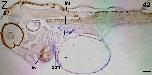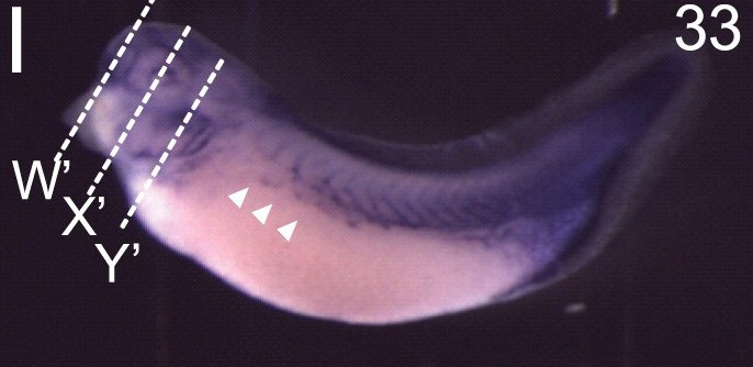 tgfbi (transforming growth factor, beta-induced, 68kDa ) gene expression in Xenopus laevis embryos, NF stage 33, as assayed by in situ hybridization, lateral view, anterior left, dorsal up. |