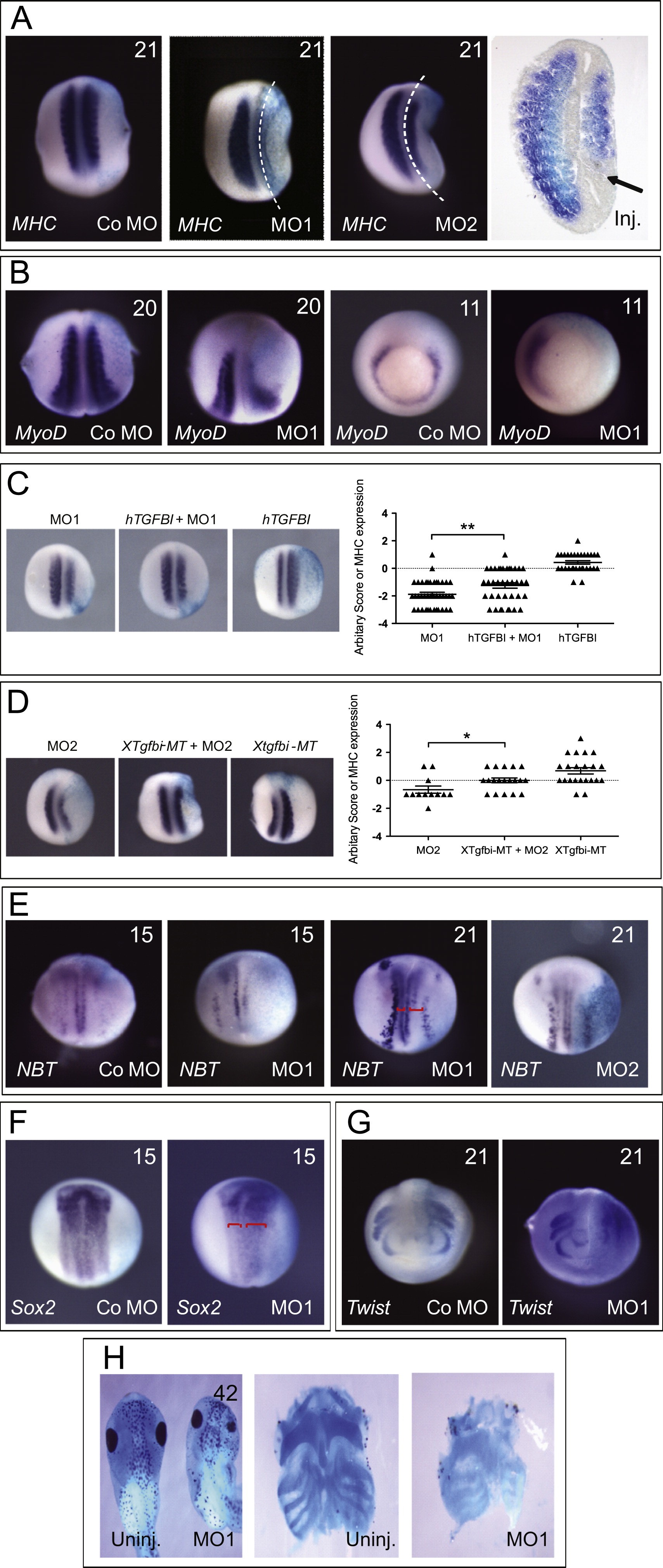 Fig. 4. XTgfbi was required for dorsal tissue specification and differentiation. Whole-mount in situ hybridization of embryos with mis-expressed XTgfbi. The injected reagents, probes, and stage of embryos are indicated in the lower right, left, and upper-right corners, respectively. The injected sides are marked by β-gal. (A) XTgfbi depletion inhibited MHC expression in whole mount and sectioned embryos at stage 21. The dashed lines indicate the bent midline. In the longitudinal sections, the injected sides are indicated by the arrows. (B) XTgfbi-depletion repressed MyoD expression in stage 20 and 11 embryos. (C, D) hTgfbi or XTgfbi-MT injection rescued the loss of MHC caused by MO1 or MO2. Summaries of MHC expression based on arbitrary scores analyzed with unpaired two-tailed Student T test (P=0.009 hTgfbi, P=0.032 XTgfbi-MT). Error bars represent s.e.m. C: Representative MHC stained embryo injected with 2 ng hTgfbi only (n=21), 2 ng hTgfbi with 34 ng MO1 (n=29) and 34 ng MO1 only (n=33), respectively. D: Representative MHC stained embryos injected with 2 ng XTgfbi-MT only (n=22), 2 ng XTgfbi-MT with 34 ng MO2 (n=19) and 34 ng MO2 only (n=14), respectively. (E) XTgfbi depletion inhibited NBT expression at stage 15 and 21. The red bars indicate the neural plate expansion. (F) XTgfbi-depletion expanded neural plate marker Sox2 at stage 15. (G) XTgfbi-depletion repressed the expression of neural crest markers Twist at stage 21. (H) Cartilage staining of representative uninjected and MO1-injected embryos at stage 42. Embryos with XTgfbi-depletion developed smaller cranial cartilage.