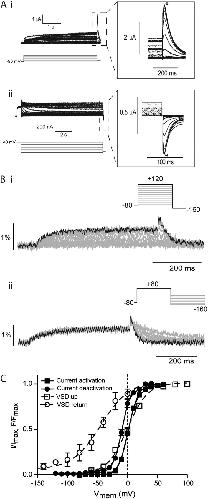 Figure 2. Effect of N-terminal truncation on mode shift of hERG channels. (A) Example traces recorded in response to protocols shown to measure the voltage-dependent equilibria of activation (i) and deactivation (ii) of Δ2–25 hERG channels. Insets are expansions of the highlighted regions. Peak currents were measured at the points marked with asterisks. (B) Example fluorescent traces recorded using voltage-clamp fluorometry in response to the protocols shown to measure activation/upward motion (i) and return (ii) of the VSD of Δ2–25 hERG. (C) Summary of voltage dependence of equilibria of activation and deactivation. Solid lines are fits of the Boltzmann equation to current data, whereas broken lines are fits of the Boltzmann equation to the fluorescent data. V0.5 values were 2 ± 0.3 mV and −10 ± 0.4 mV for current activation and deactivation, respectively (SEM; n = 7). V0.5 values were measured as 0 ± 1 mV (SEM; n = 8) and −43 ± 7 mV (SEM; n = 11) for activation and return of the VSD, respectively.