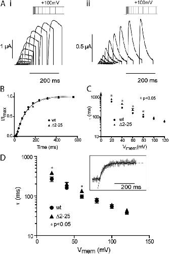 Figure 3. Effect of N-terminal truncation on kinetics of hERG activation. (A) Typical examples of currents recorded in response to the envelope of tails protocols shown for E518C (i) and Δ2–25 (ii) hERG channels. In these examples, the activating potential was 100 mV. (B) Peak tail currents plotted against the duration of the activating pulse for the examples shown in A. The black line is a fit of a single exponential to the activation time course. (C) Summary of the voltage dependence of rates of activation of ionic current. Error bars are SEM; n ≥ 8. (D) Summary of the voltage dependence of the rates of VSD activation/upward motion derived from single exponential fits to the fluorescent time course using the same protocol illustrated in Fig. 1 B (i). Error bars are SEM; n ≥ 7. The inset shows example fits to fluorescent traces from MTSR-labeled E518C recorded at 100 mV.